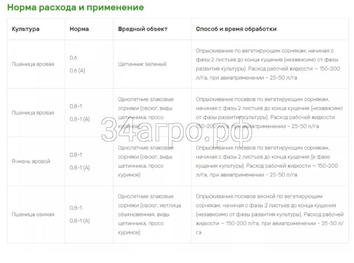 Опрыскивание посевов весной по вегетирующим сорнякам, начиная с фазы 2 листьев до конца кущения (независимо от фазы развития культуры). Расход рабочей жидкости – 150-200 л/га, при авиаприменении – 25-50 л/га