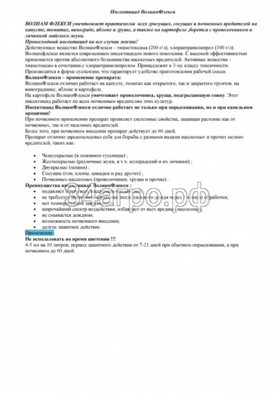 Волиам Флекси, СК — инсектицид, контролирующий практически всех насекомых-вредителей картофеля и овощных культур. Эффективен против чешуекрылых (гусениц), жесткокрылых (жуков и личинок), двукрылых, сосущих насекомых (тли, цикадок, клопов и др.).